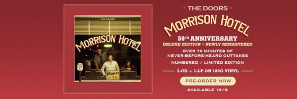 MORRISON HOTEL: 50TH ANNIVERSARY DELUXE EDITION 2CD/1LP includes the original album newly remastered by The Doors’ longtime engineer and mixer Bruce Botnick, plus a bonus disc of unreleased studio outtakes, and the original album on 180-gram virgin vinyl.